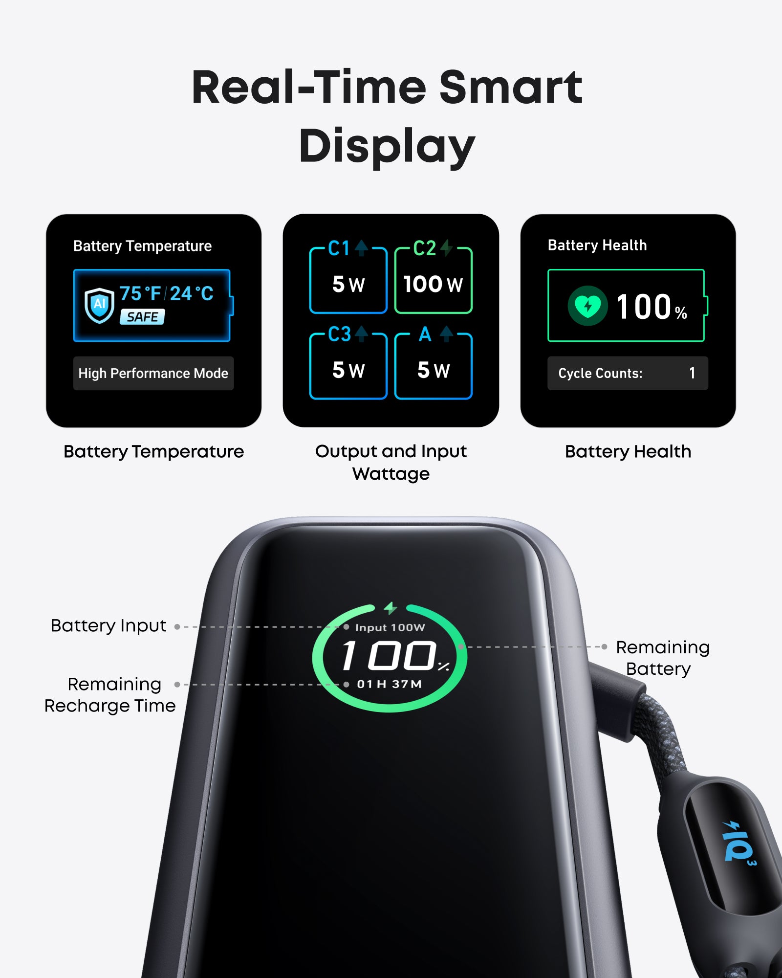 - 25,000mAh for Long-Haul Power: Set off on extended journeys with a huge 25,000mAh capacity that supports your devices through multiple uses, complete with 100W ultra-fast recharging that fuels the power bank to 30% in just 20 minutes.