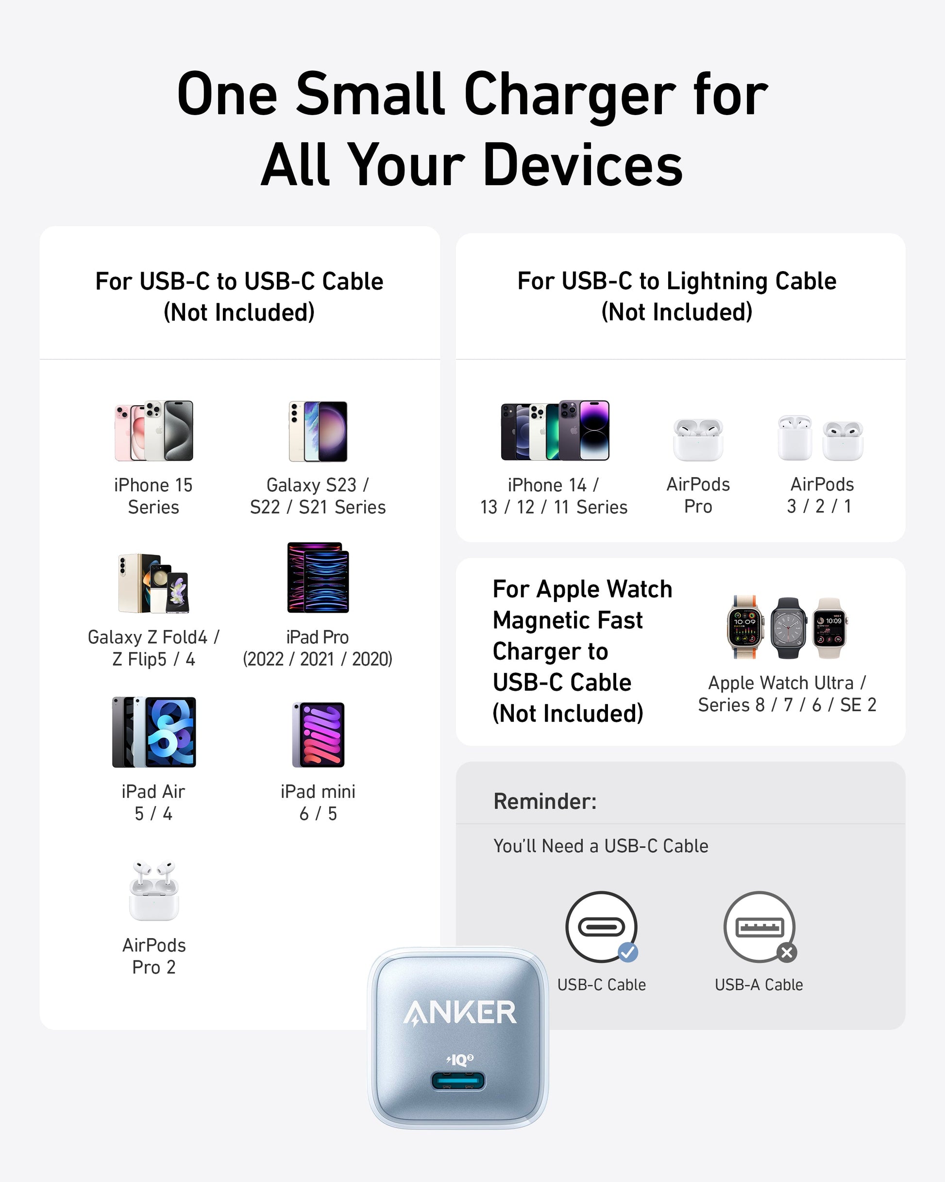 - What You Get: Anker Nano Charger (20W), welcome guide, our worry-free 18-month warranty, and friendly customer service (cable not included).