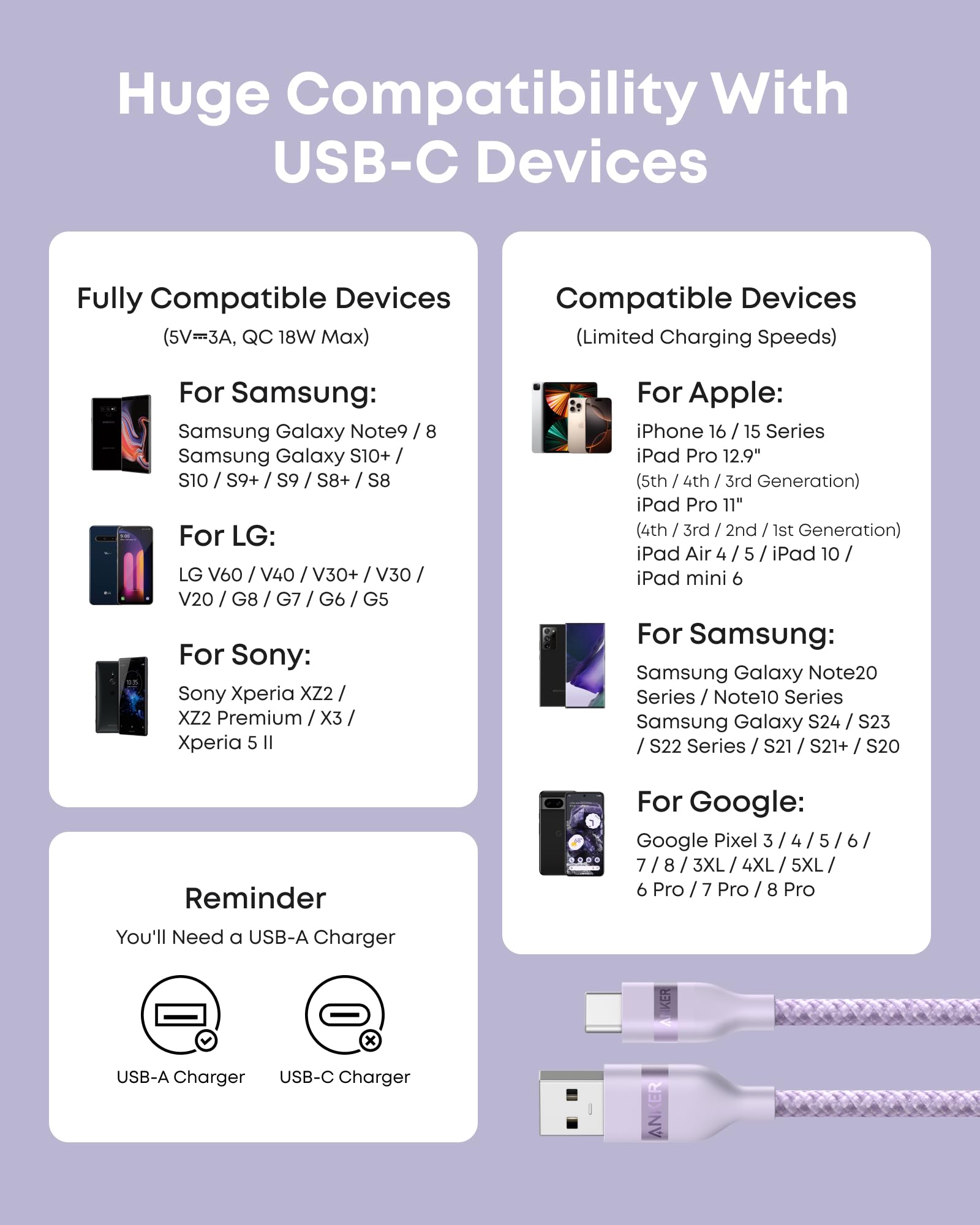 - What You Get: Anker USB-A to USB-C Cable (3 ft/6 ft, Upcycled-Braided), welcome guide, 24-month warranty, and our friendly customer service.